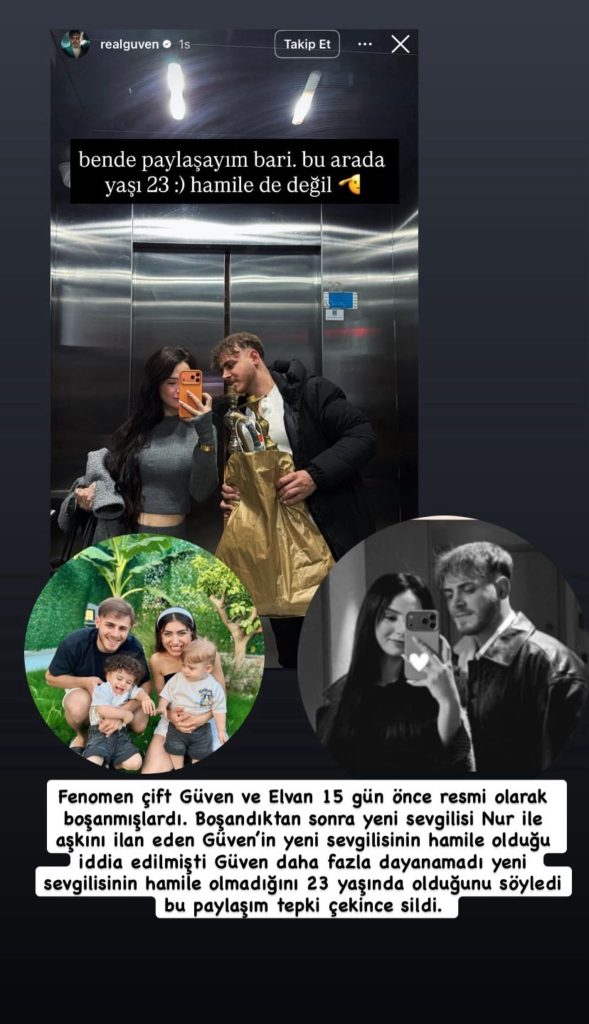 Güven ve Elvan boşandı haberinin tazeliğini koruduğu günlerde, Güven’in yeni sevgilisi Nur ile paylaştığı kareler sosyal medyada büyük yankı uyandırmıştı. Kısa sürede gündemin zirvesine oturan bu yeni ilişkiye dair ortaya atılan hamilelik iddiası, çiftin takipçileri arasında büyük bir tartışma başlattı.