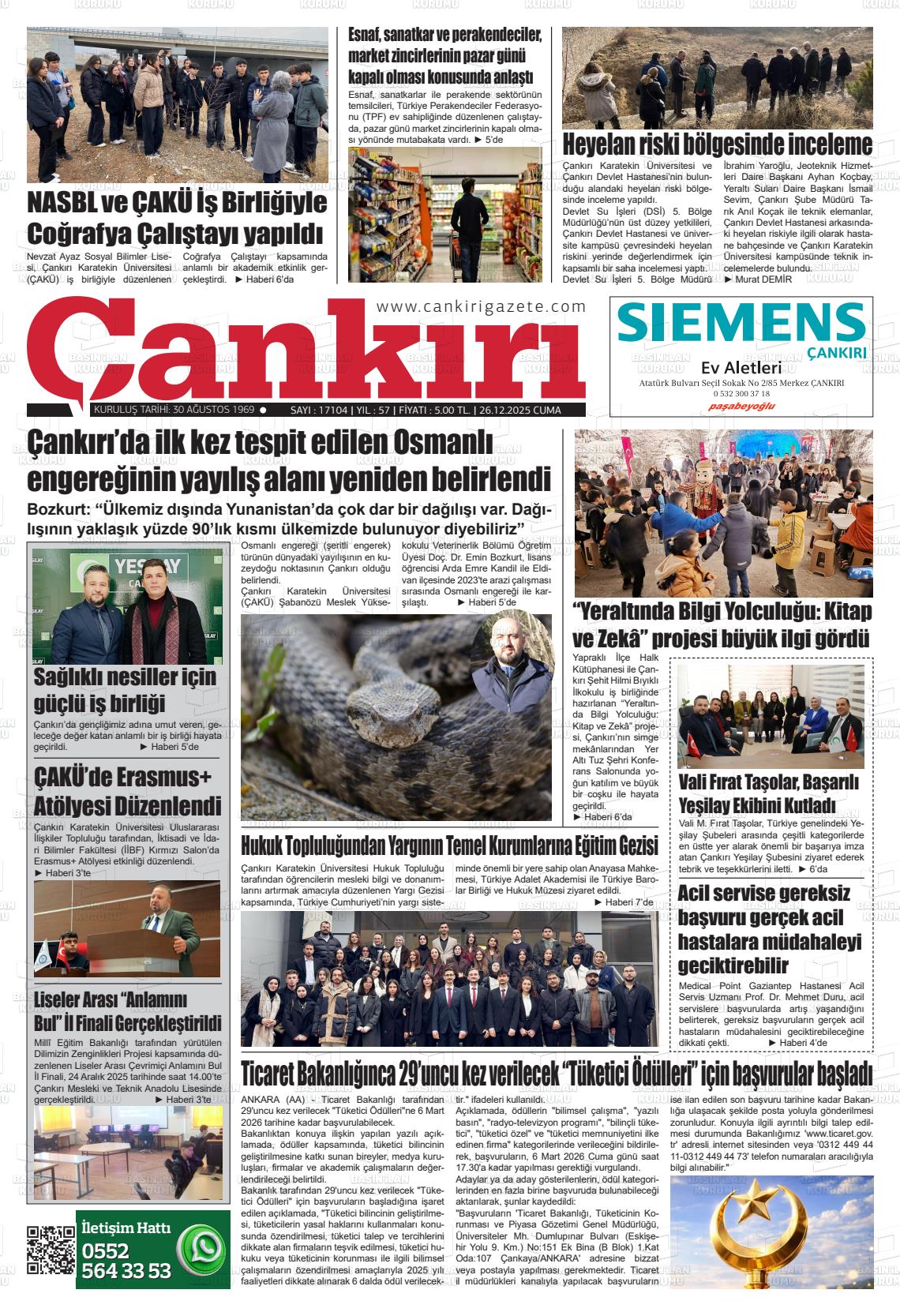 Çankırı Yerel Gazeteleri 26 Aralık 2025, Cuma Günü Manşeti