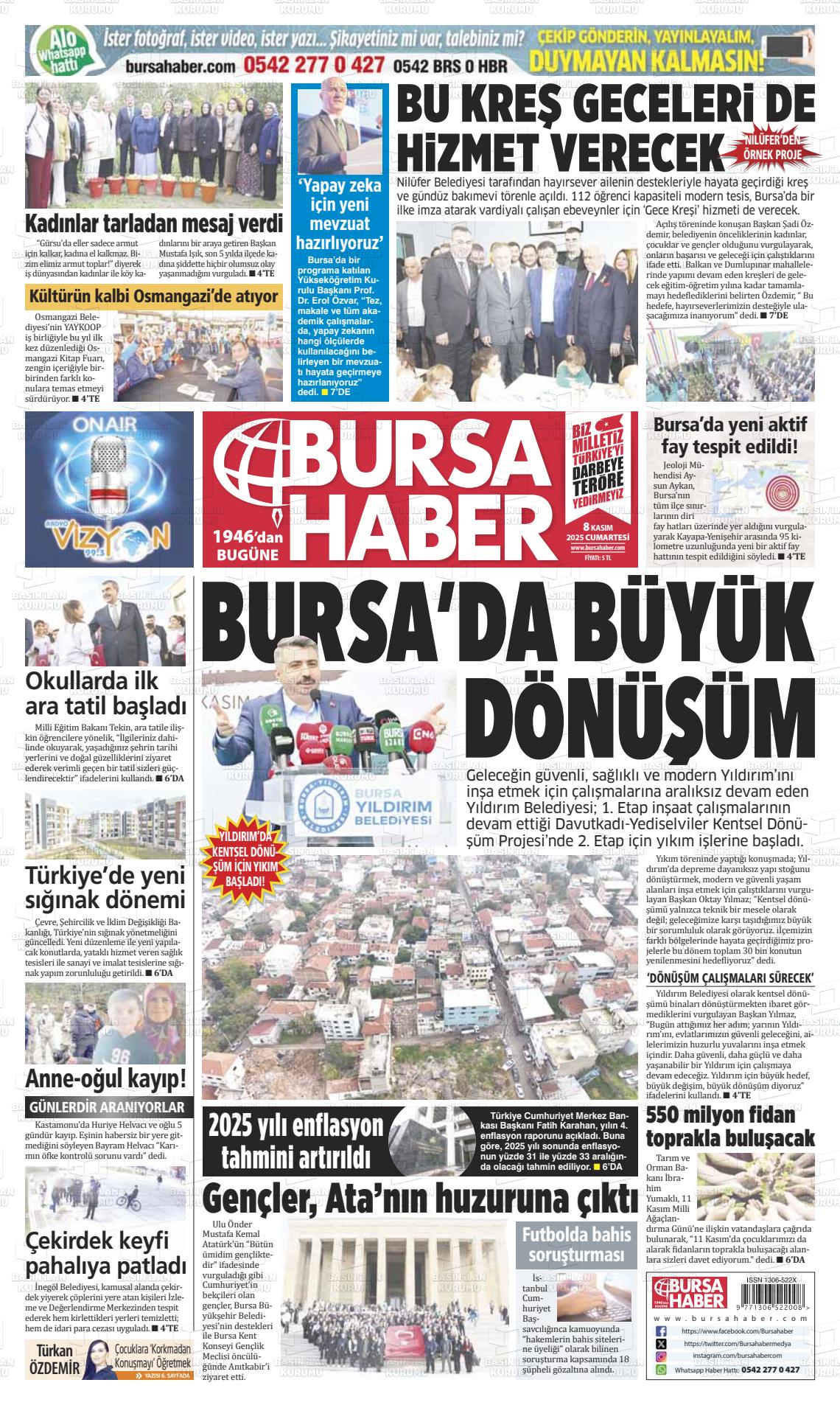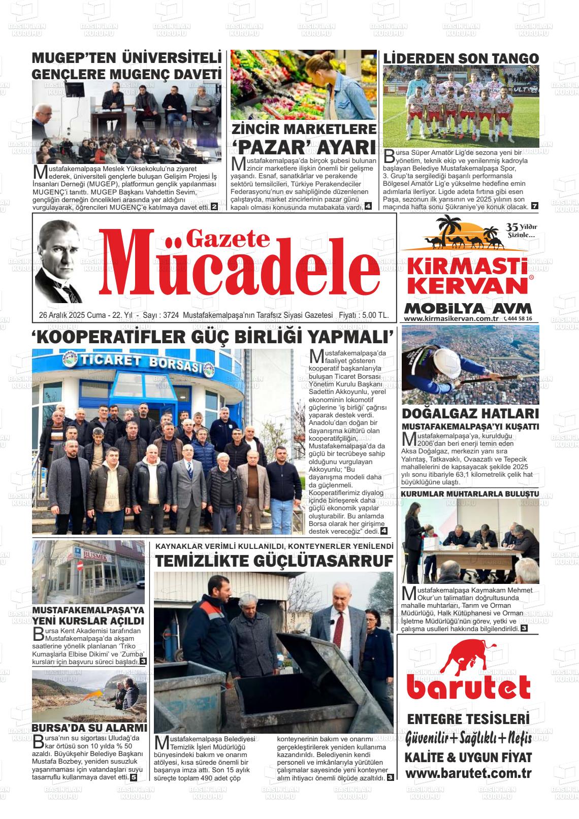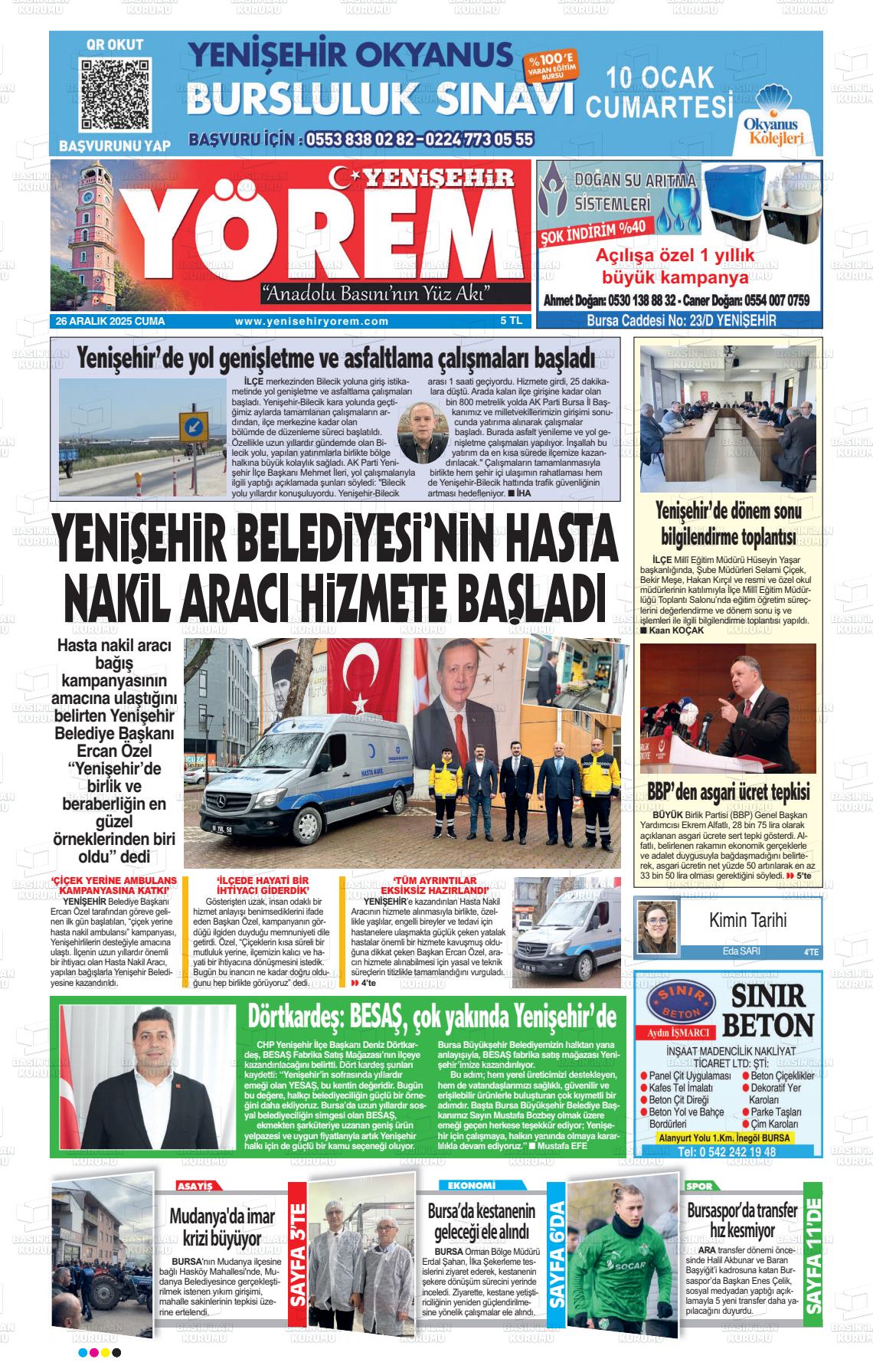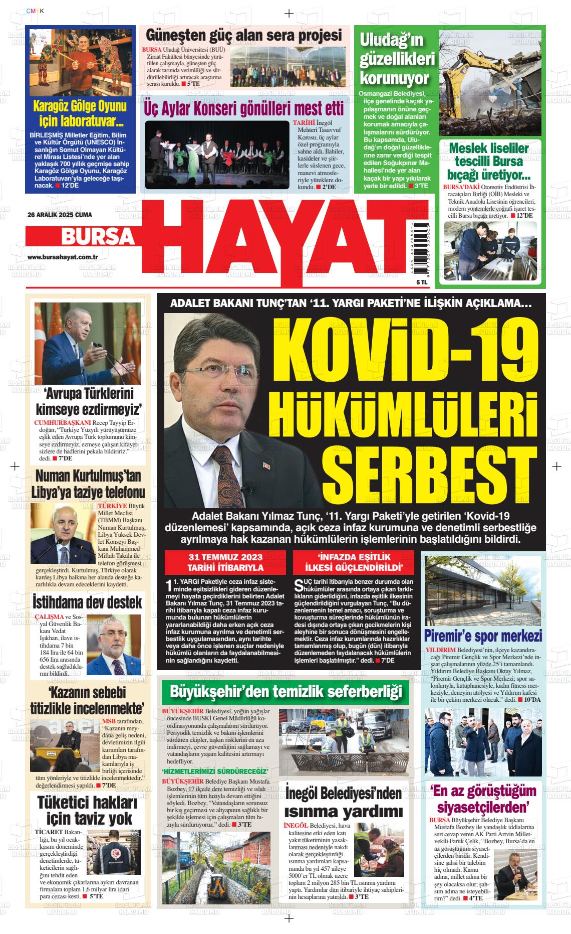 Bursa Yerel Gazeteleri 26 Aralık 2025, Cuma Günü Manşeti