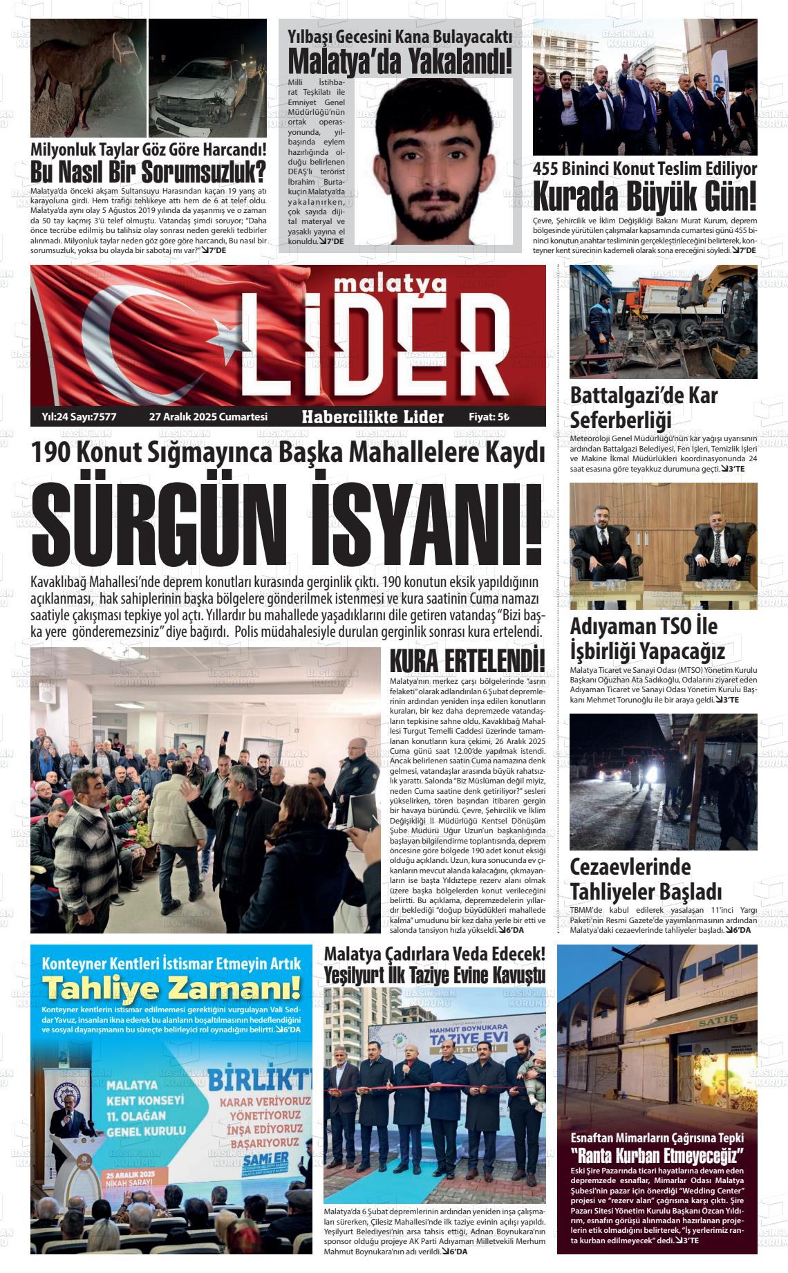 Malatya Yerel Gazeteleri 26 Aralık 2025, Cuma Günü Manşeti