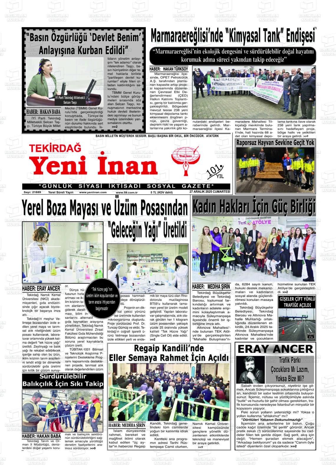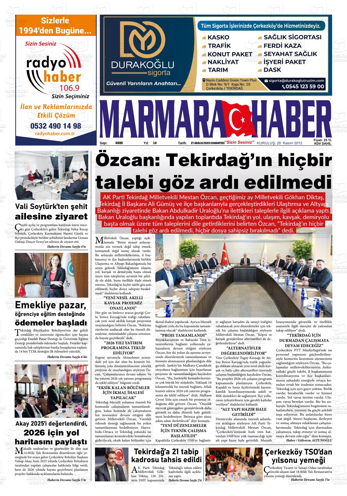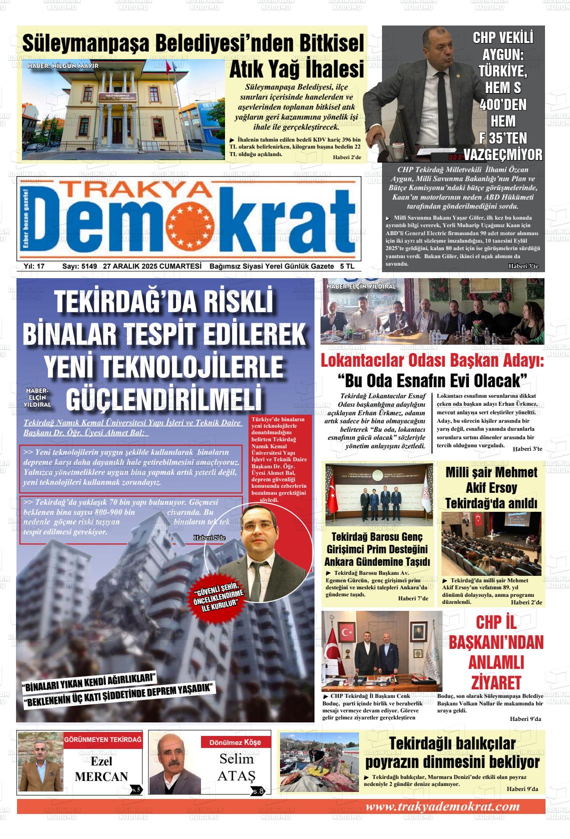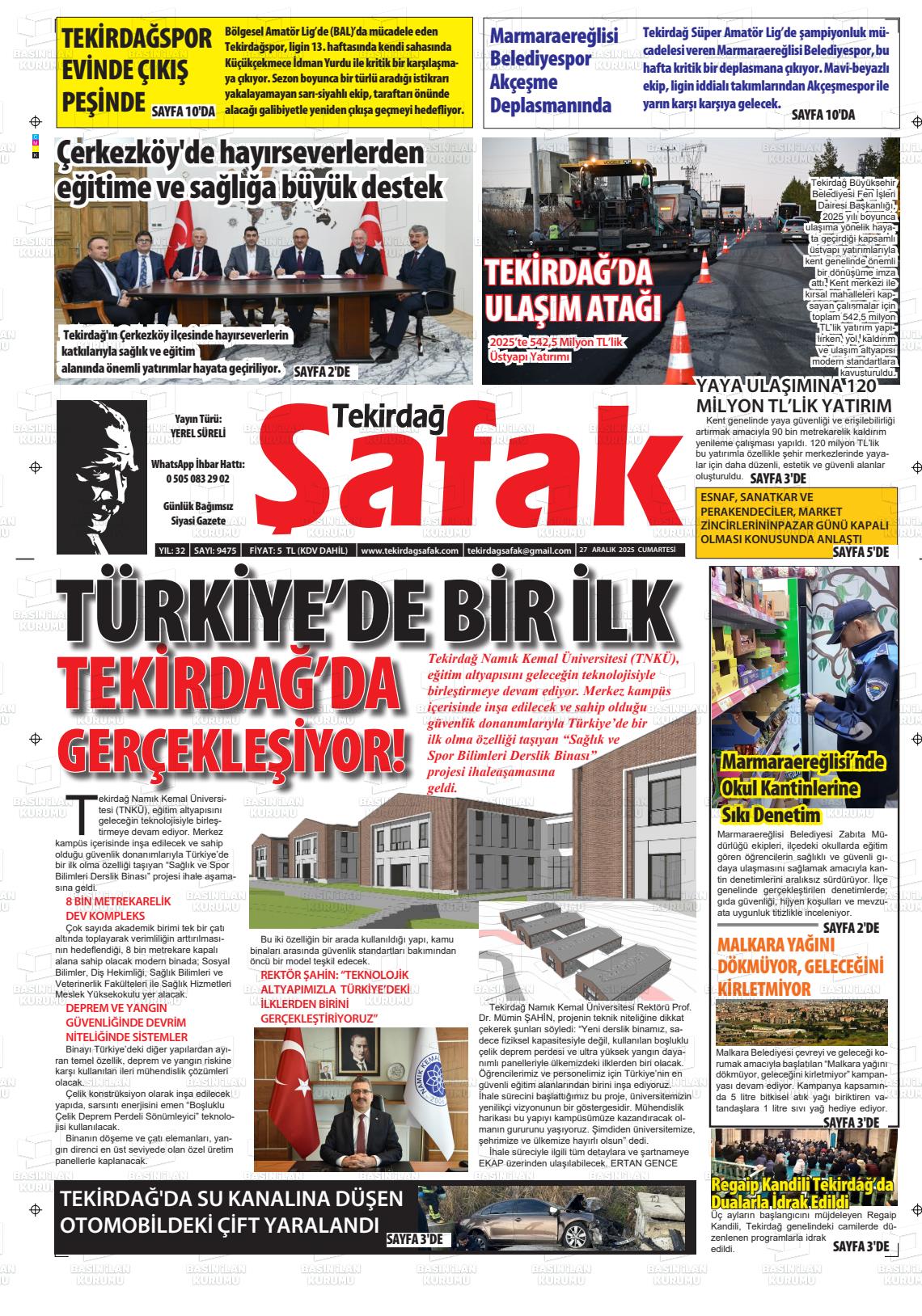 Tekİrdağ Yerel Gazeteleri 27 Aralık 2025, Cumartesi Günü Manşeti