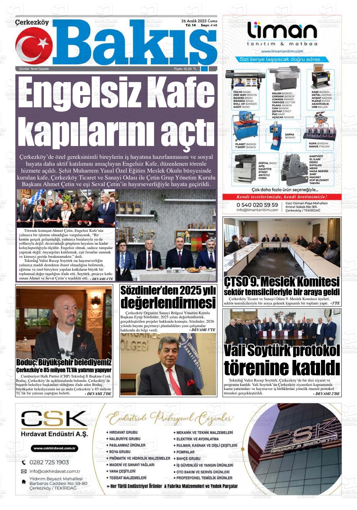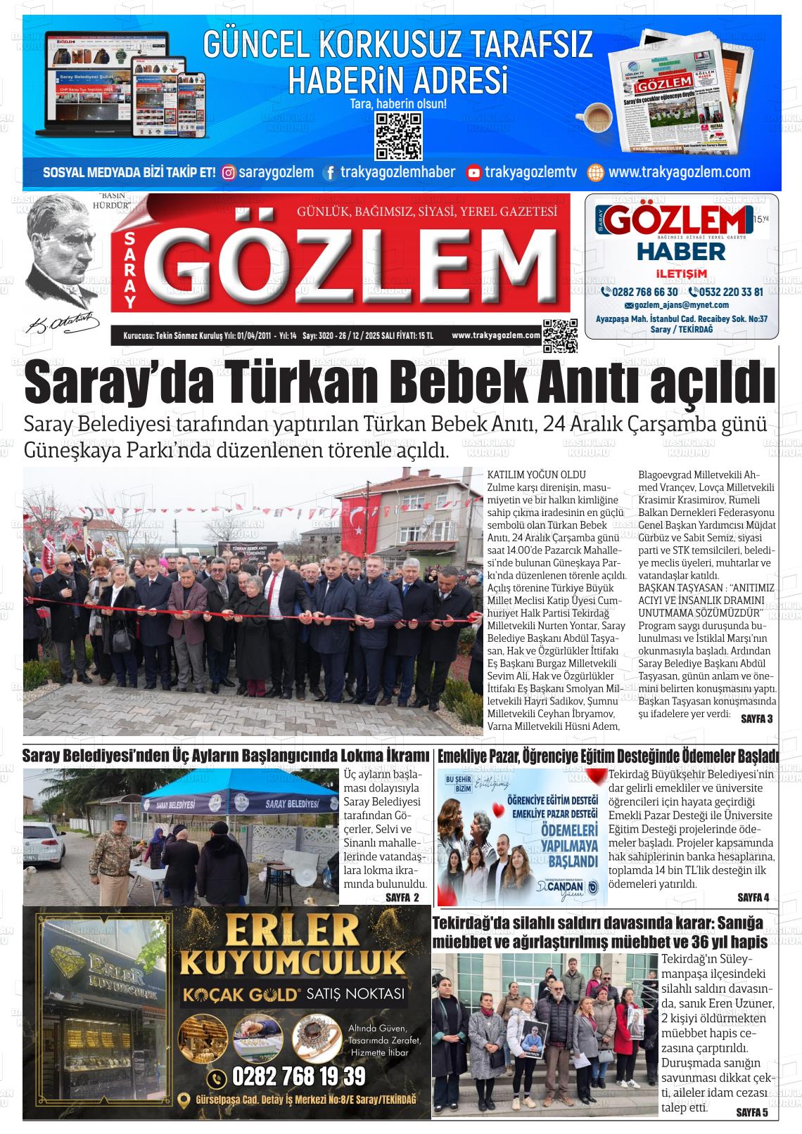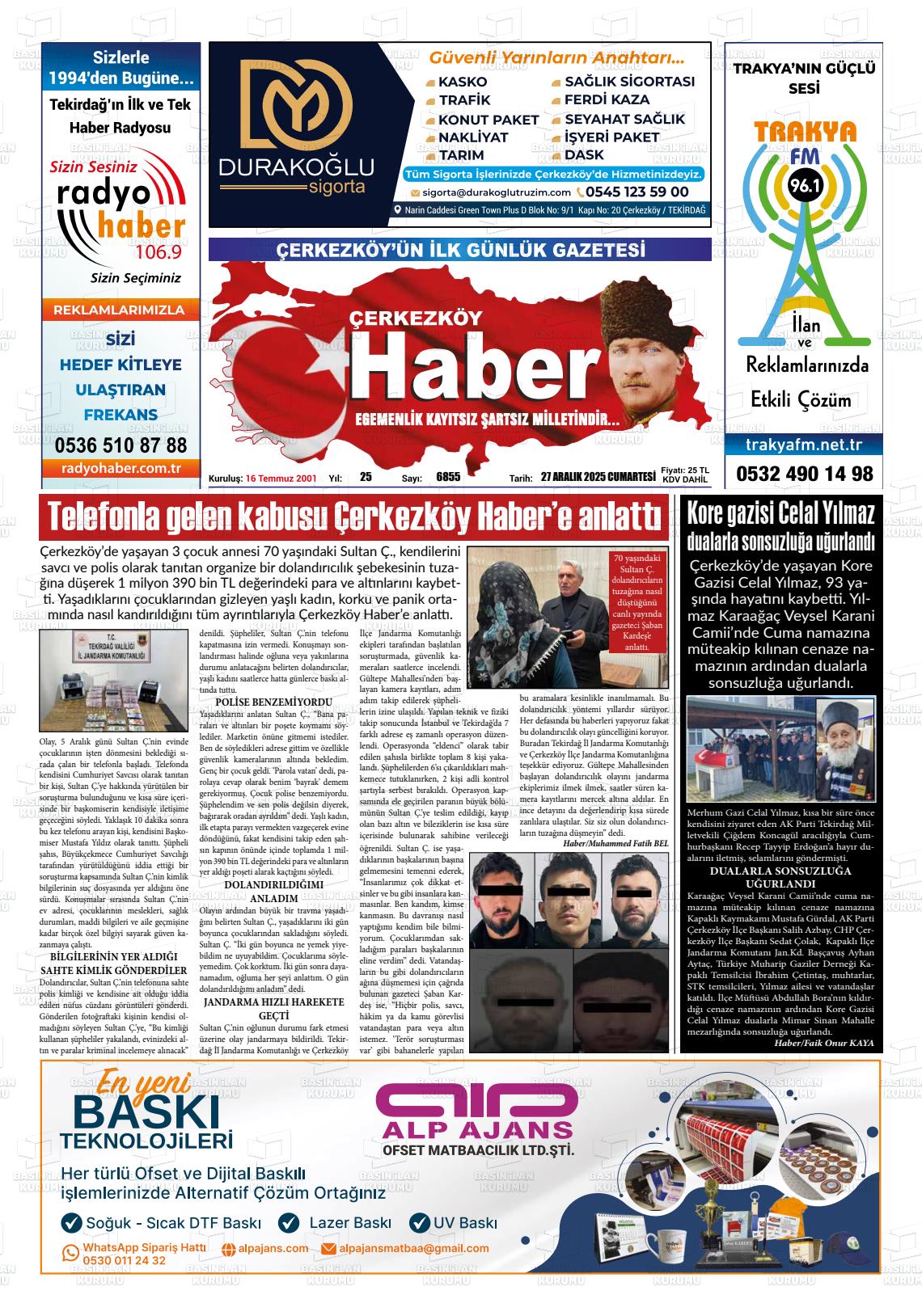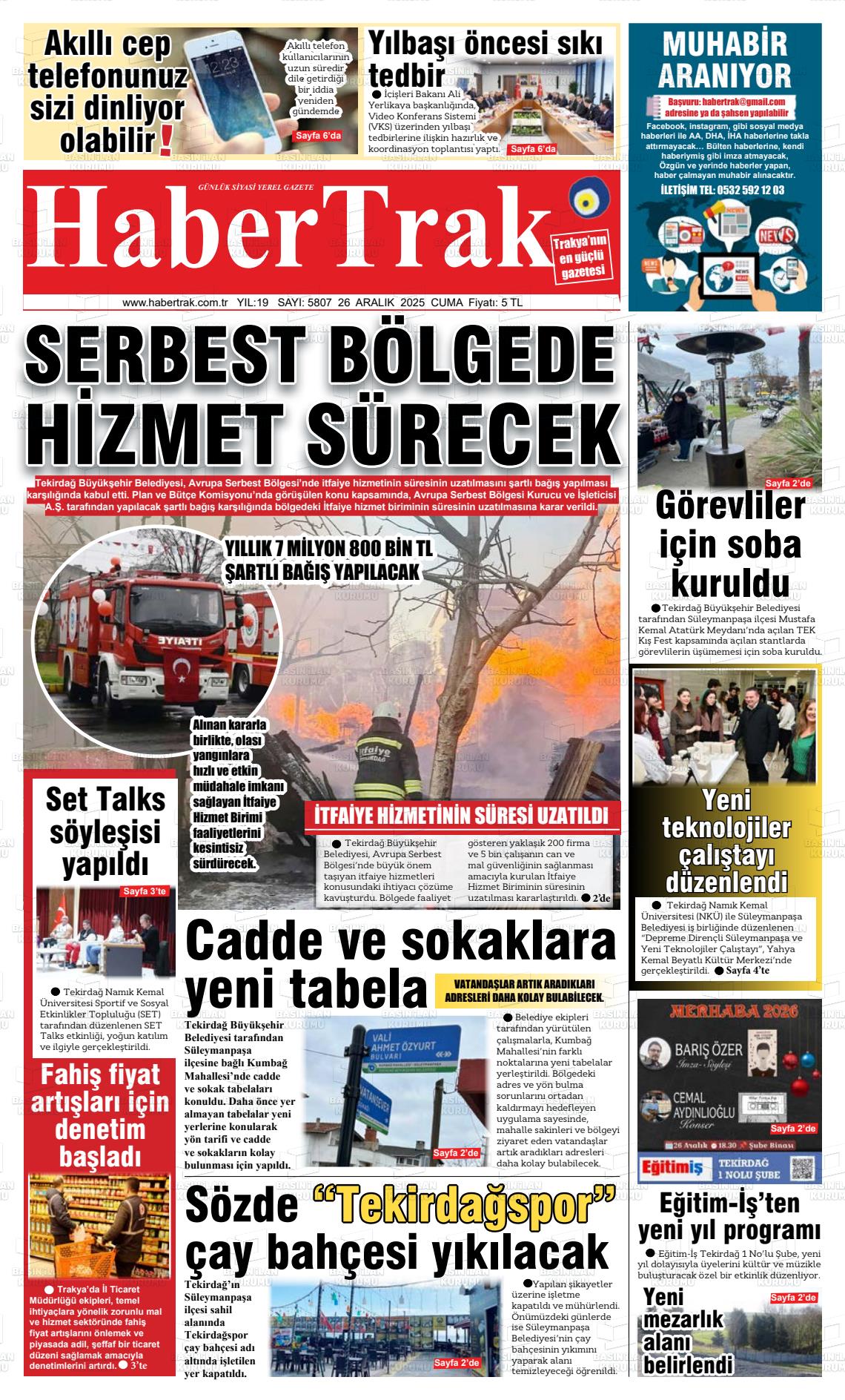 Tekİrdağ Yerel Gazeteleri 27 Aralık 2025, Cumartesi Günü Manşeti