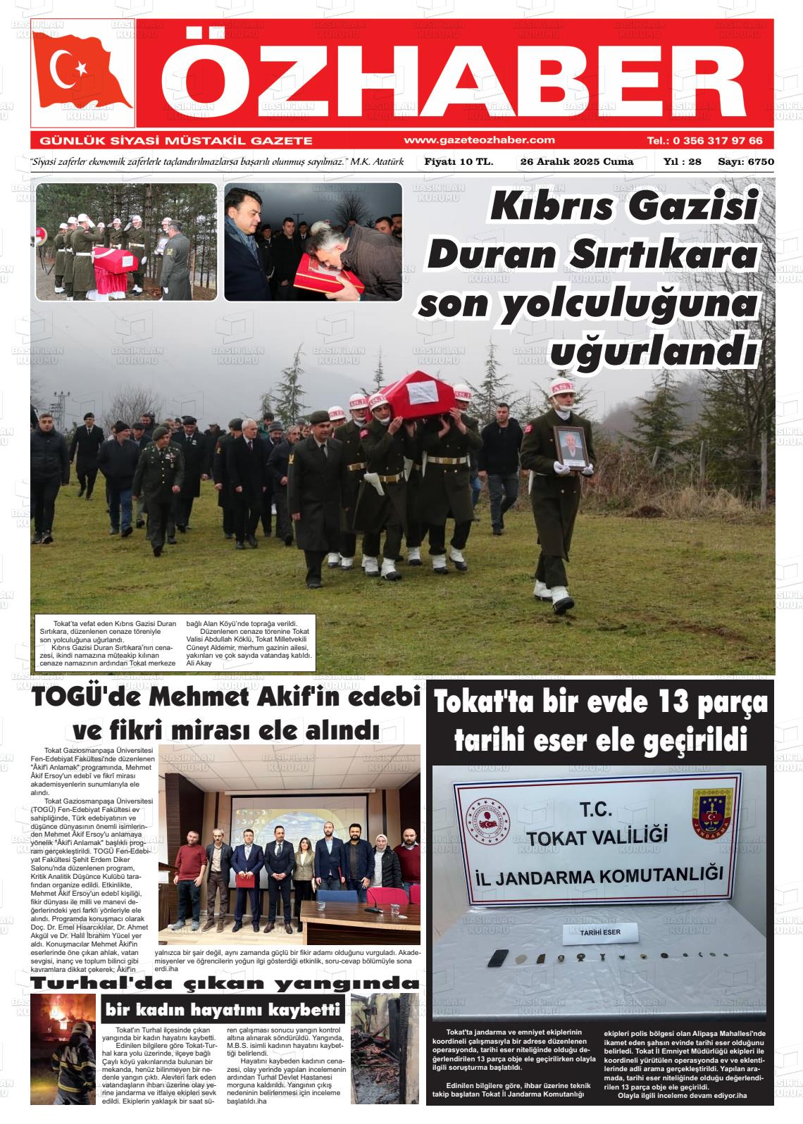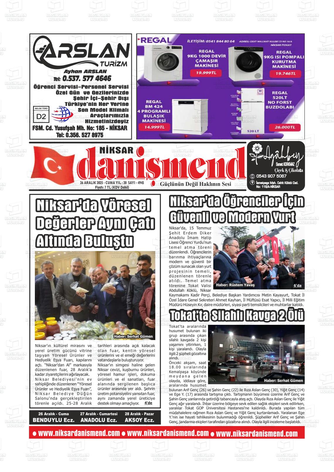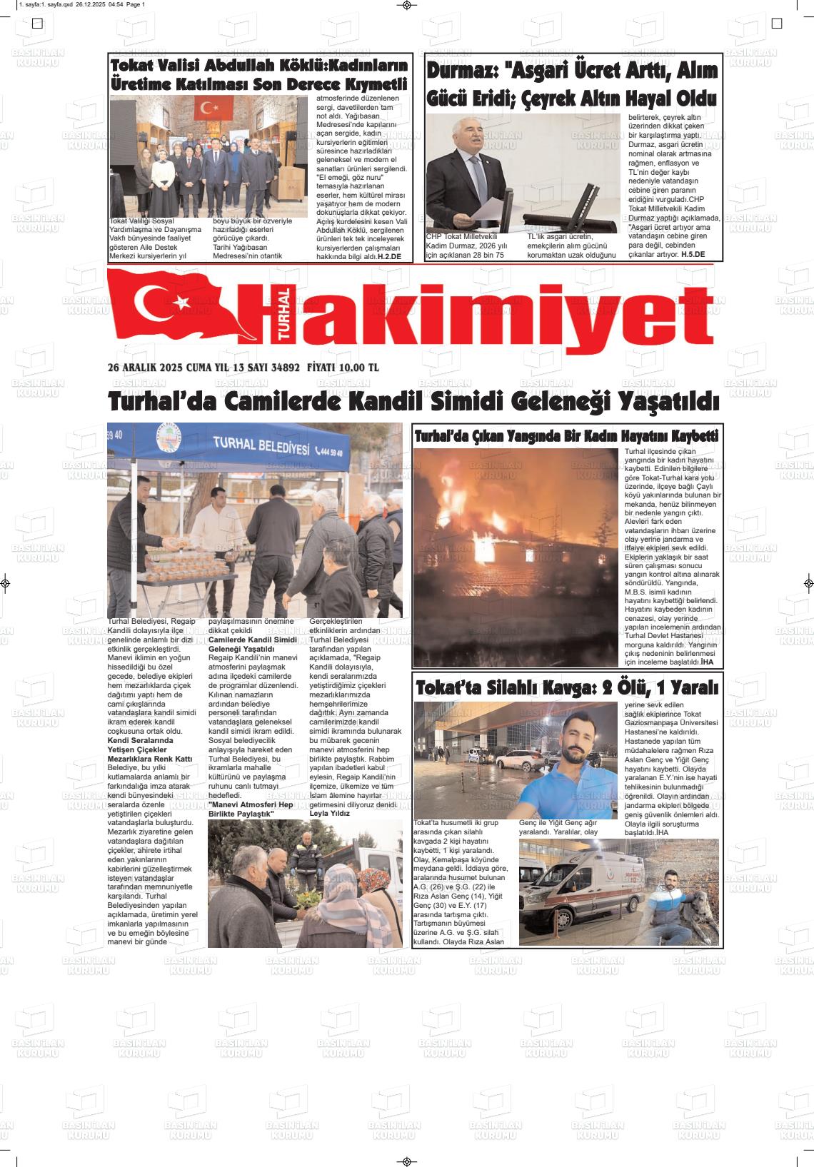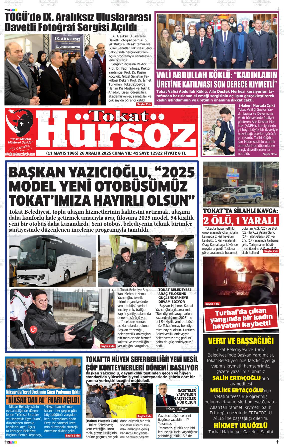 Tokat Yerel Gazeteleri 26 Aralık 2025, Cuma Günü Manşeti