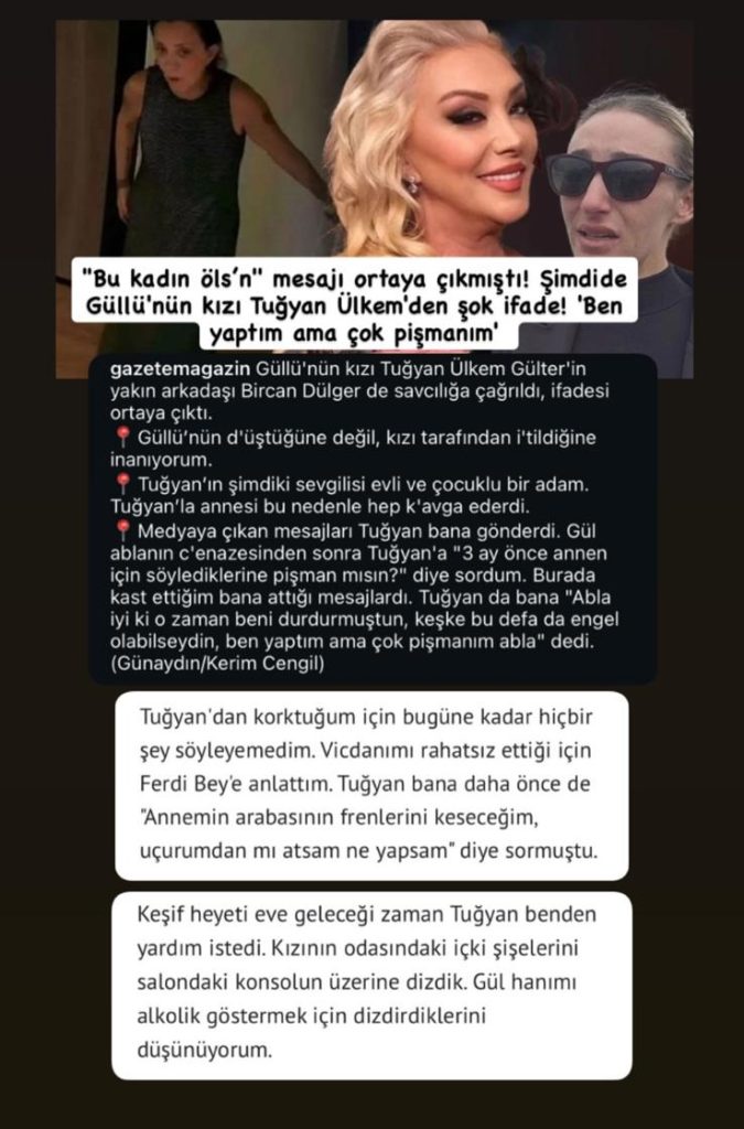 Ünlü arabesk ve fantezi müziğin sevilen sesi Güllü’nün ölümü hakkında ortaya çıkan şoke edici iddialar, magazin gündemini sarsmaya devam ediyor. Günler önce kulislerde konuşulan “Bu kadın ölsün” şeklindeki korkunç bir mesajın izi sürülürken, olayın merkezine Güllü’nün kızı Tuğyan Ülkem oturdu. Gündeme bomba gibi düşen son gelişmede, Tuğyan Ülkem’in emniyette kan donduran bir itirafta bulunduğu öne sürüldü.